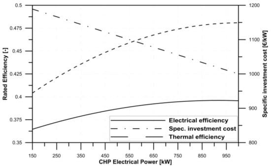 Total PES (TPES) and simple payback period (SPB) are the main output of the evaluation algorithm, which depend on the specific operation strategies adopted for the CHP engines. An ON/OFF operation was imposed to each cogeneration plant (i.e., the electrical power delivered by the plant depends on the engine size). The engines are switched ON when their operation results in a positive contribution to the PES. Otherwise, when no energetic advantage is achieved, the engines are switched OFF. In particular, according to the management strategy adopted, any hour of the year that is characterized by positive values of the primary energy saving index is included in the operating range of the CHP plant. Variations in the nominal electrical () and thermal () efficiency with the engine size were imposed, according to the curves represented in Figure 5. The efficiency curves in Figure 5 are based on the rated values of some cogeneration natural gas engines currently on the market. Figure 5. also depicts the regression curve adopted to evaluate the specific investment cost of each single cogeneration unit () as a function of its size. The nominal thermal power of the CHP engine is then evaluated as follows: