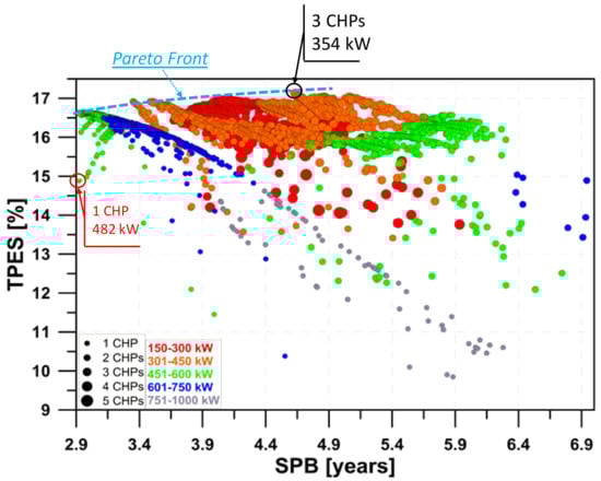 Figure 6 shows, on the objective function plane, the distribution of the calculated solutions obtained through the maximization of the TPES and the minimization of the payback period (SPB). Specifically, the bubble chart includes, for each numerical solution, details concerning the number CHP engine adopted and the electrical power output provided by each CHP engine (i.e., CHP engine size). The Pareto optimal front was also depicted, highlighting how solutions that maximize the total energy savings are characterized by an increased payback period. Moreover, this result is in agreement with other analyses available in the literature [59,65].
