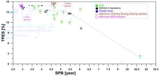 It should also be noted that low TPES increases can be achieved with a high worsening of the payback period. Dominant solutions show primary energy saving exceeding 16.5%, payback periods of 2.9–4.6 years, and the adoption of one to three CHP engines with sizes in the range of 260 to 570 kW for each engine. In particular, the plant solution ensuring the minimum payback period is characterized by one CHP engine providing 554 kW of electric power while the maximum PES solution (highlighted by a black circle in Figure 6.) consists of three CHP engines providing about 350 kW of electric power. This solution allows for a TPES of over 17% and a SPB of just over 4.5 years. Figure 6. also shows how modular plants consisting of two or three CHP engines ensure a reasonable compromise between energetic and economic objectives. Figure 7 shows how, unlike heuristic or random techniques, the statistical genetic optimization algorithm MOGA II provides fast convergence toward global optimum solutions starting from the initial set of solutions belonging to the DoE (Design of Experiment). Specifically, solutions in the objective functions space are labeled according to their iteration number, while DoE solutions are depicted with green circles. After DoE methods were performed and solution number 67 identified, it should be noted that only three subsequent iterations were required by MOGA II to find a solution reasonably close to the Pareto dominant solutions (i.e., close to the minimum SPB solution).