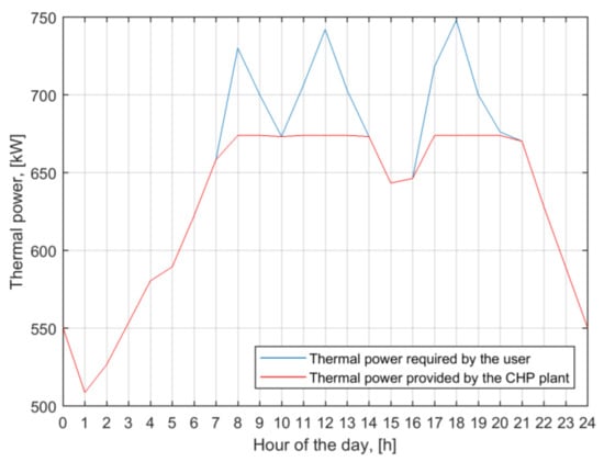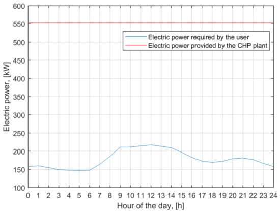 Finally, Figure 8 shows the electric power delivered by the CHP plant and the electrical load demand of the user with reference to the minimum SPB solution (i.e., one CHP engine providing 554 kW of electric power output) and a specific day of the year. Figure 9 shows the difference between the thermal power provided by the same system configuration and the thermal power required by the user.
