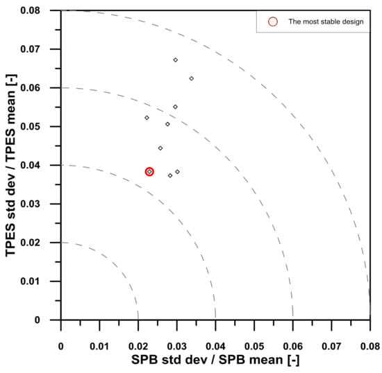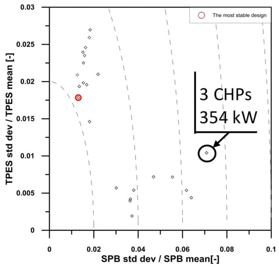 Figure 10 shows that the standard deviation accounts for up to 7% of its mean value for the payback period. The ratio for the TPES is always under 3%. Solutions were also ranked according to the arcs of circumference, defined as equal-stability curves, and are represented in Figure 10. The most stable solution is highlighted in red and its main characteristics are summarized in Table 3. It should be noted that this Pareto solution obtained through the robust design approach becomes a dominated solution if a deterministic approach is adopted for the optimization process, as demonstrated in Figure 6, where this solution is highlighted with a red circle. Figure 10 also shows that the most stable solutions include the best energetic performance solution obtained through the deterministic approach (i.e., three CHP engines—354 kW of electric power highlighted in Figure 6). In this last configuration, the uncertainties related to the actual commercial availability of the CHP engine size under consideration have a greater effect on the economic sensitivity, while the ratio for the TPES is around 1%, showing high energetic stability.