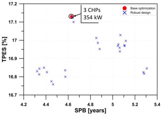 In fact, the red circle highlights the maximum TPES solution (three engines with 354 kW of electric power output) represented in Figure 6. The blue crosses represent 25 sample solutions that belong to a single statistical distribution for the CHP engine size (i.e., the same robust design solution) whose mean value is just 354 kW, which characterizes the maximum TPES solution represented in red. Figure 11 shows that the SPB can range from 4.3 to 5.3 years, while the TPES could vary in the range 16.7–17.1 when the robust design approach is adopted. These energetic and economic fluctuations are due to the uncertainties related to the actual commercial availability of the considered engine size. To estimate the performance fluctuations due to eventual variations in the energetic and economic scenarios, a further MORDO problem was solved. Specifically, the selling price of the electricity in the three price periods, the efficiency of the Italian thermoelectric generation, and the selling price of the EECs granted in Italy to high-efficiency CHP plants were represented through normal probability distributions (Table 4).