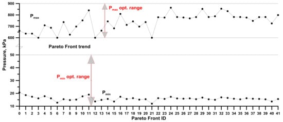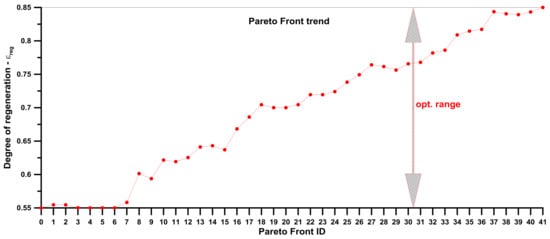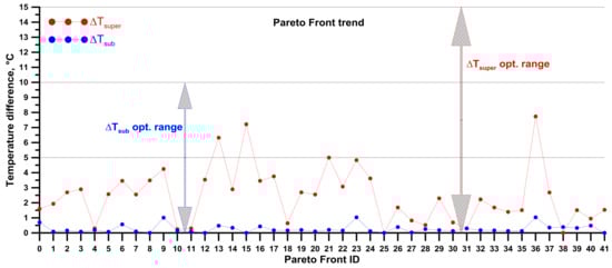 The optimization approach described in this paragraph involves the coupling of the thermodynamic model of the ORC system with the evolutionary algorithm MOGA II. Starting from the assigned values of the input parameters and the ORC system model deeply discussed in [35], the optimization process enabled the identification of a set of Pareto dominant solutions for the specific system configuration and application. With reference to the general scheme of the optimization process represented above in Figure 4, analyses were conducted by selecting the following two objective functions: