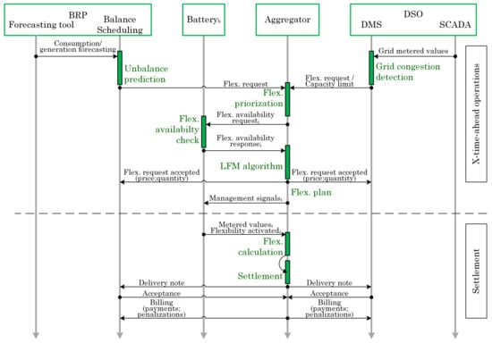 Figure 5 as an example. It is divided in two main parts: operations needed to schedule flexible resources and the flexibility settlement process. It contains the case where the BRP and the DSO can request flexibility at the same time. For simplicity, the flexible resource represented in this figure is a single battery, but it applies to a portfolio of different flexible assets. Scheduling tasks can happen days, hours or minutes ahead of the final delivery. This figure is open to be adapted to different cases. The action sequence of LFM is listed as follows: