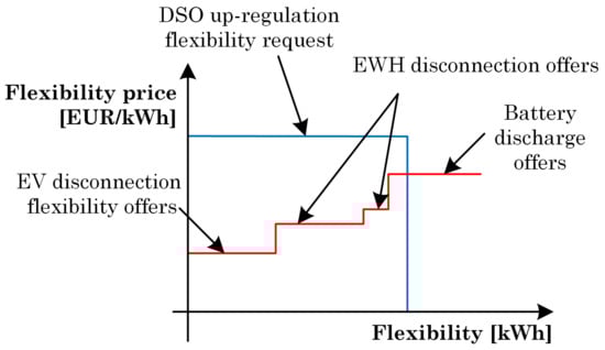 The corresponding offer curve is generated according to their activation fees if they are reserved during this period, and also considering their available estimated power curtailment capacity. The offer curve is sorted in ascending order to prioritize the least expensive offer instead of the most expensive one. The flexibility offer curve is composed of different EV disconnection offers from different EVs at the same price. Later on, a group of Electric Water Heaters (EWH) is included as up-regulation sources. They are aggregated at two price levels according to their flexibility contracts. Finally, a group of batteries offers their up-regulation capability at the highest price. In this case, all EV, all EWH and some batteries are used to fulfil the DSO request.