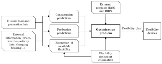Figure 7 shows the algorithm high-level flow diagram, the general inputs and outputs together with the potential required functionalities. The first step is to forecast the energy consumed and produced in the aggregator portfolio. This is done using historic consumption and weather data, among others. This forecast must distinguish between flexible and inflexible resources. Additionally, it is necessary to estimate the status of flexible assets considering their physical and contractual constraints. All this information is introduced in the optimization problem, and it returns the flexibility plan explained before. This process can be repeated every time there is a new event in the forecasting system or an external agent creates a new flexibility request.