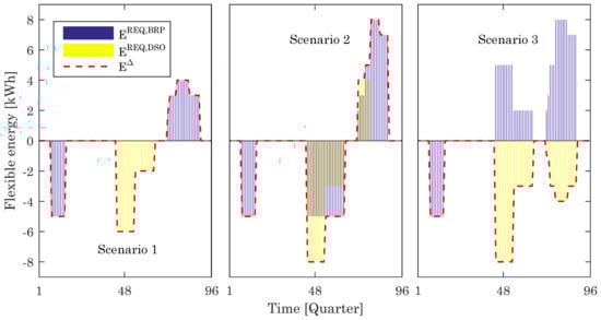 The function is the flexibility that the aggregator has to provide, and this function is composed by external requests from agents like DSOs () and BRPs (). Additionally, the prosumer flexibility need () is considered, as well. In principle, if there is no external flexibility requests, the prosumer need prevails. Moreover, prosumer needs could be more beneficial than the external offers in some specific cases. When external agents request up-regulation, it is defined as positive () and negative for down-regulation ().
