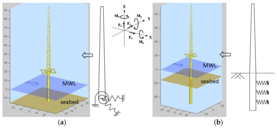 - Bush, E.; Manuel, L. The influence of foundation modeling assumptions on long-term load prediction for offshore wind turbines. In Proceedings of the ASME 28th International Conference on Ocean, Offshore and Arctic Engineering, Honolulu, HI, USA, 31 May–5 June 2009. [Google Scholar]