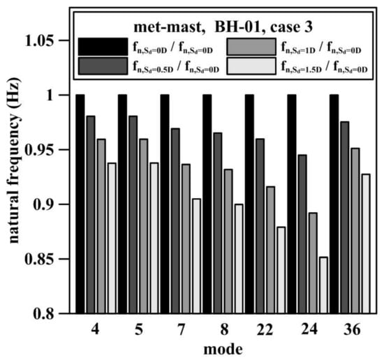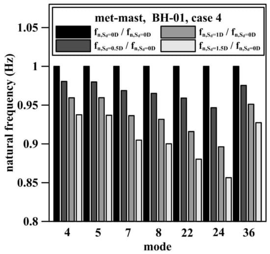 5.2. Effect of Seabed Elevation Caused by Scour on the Natural Frequency