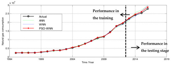 - The PSO-WNN model successfully predicts gas consumption as reflected by a MAPE value of 2.32% for prediction, and outperforms others. Based on the experiment shown in Figure 4, it is obviously that WNN model performs better than ANN model, which can be explained as, by combining the wavelet and neural work, WNN obtains strong function approximation ability, especially on the catastrophe points. Moreover, by adjusting the wavelet parameters and applying a dynamic learning rate mechanism for updating the connection weight values, WNN can effectively avoid falling into the local optimum. PSO-WNN model outperforms WNN model, which can be interpreted as the optimization of network weights and wavelet parameters using PSO algorithm effectively improves the forecasting precision and reduces fluctuation of WNN model.