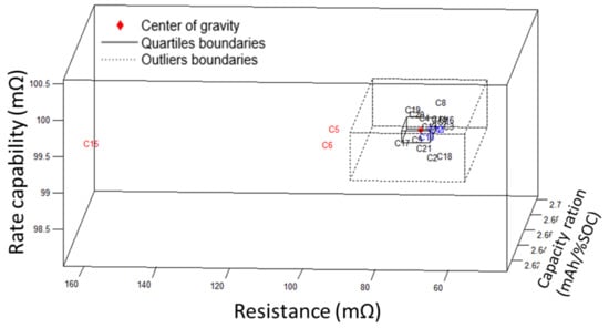 Cell-to-cell variations summary showing the distribution of resistance, rate capability and capacity ration on a 3D scale. Outliers were defined as any value with a deviation above 3 times the standard deviation compared to the average value. Cells 5, 6 and 15 were not used to produce 4S battery packs.