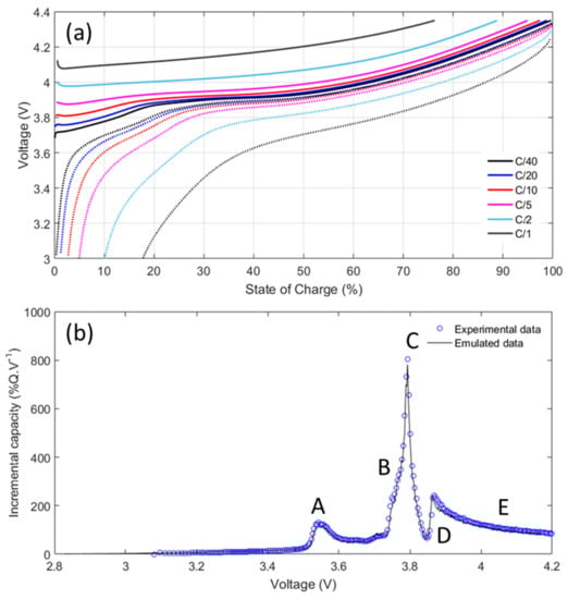 (a) Voltage vs. state-of-charge curves for the positive electrode in half cell configuration at rates ranging from C/40 to C/1 in charge and discharge; (b) RPT1 cell emulation using the positive electrode data and stock graphite from [].
