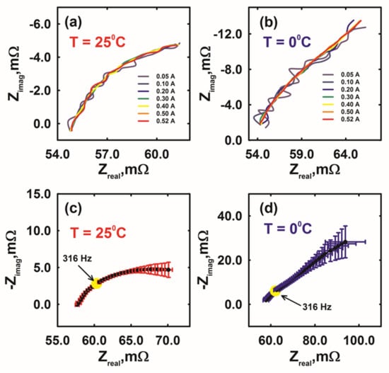 Figure 3c,d show the average impedance and variance for EIS collected at 10% SOC increments between 10–100% for (c) 25 °C and (d) 0 °C between 100–1000 Hz, respectively. Close inspection of the impedance spectra shows a minimum variance in both the real and imaginary components at 316 Hz which corroborates previous findings for this commercial lithium-ion cell [,]. The results suggest that the SOH frequency provides the least variance in impedance response even with changes in temperature.