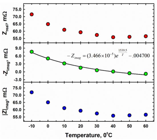 Temperature effects on the real and imaginary components of the impedance at fSOH. An empirical relationship is given for imaginary impedance, −Zimag, as a function of temperature.