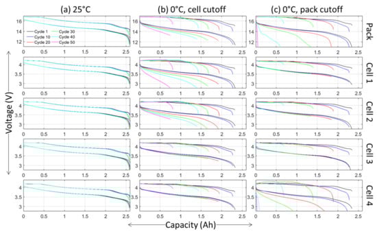 Figure 5 shows the charge/discharge vs. voltage curves for each individual cell within the 4S packs at three conditions for cycles 1, 10, 20, 30, 40 and 50: (a) 25 °C; (b) 0 °C with 2.75 V individual cell cutoff and (c) 0 °C with 11.0 V pack voltage cutoff. Charging was the same for all experiments with a 16.8 V cutoff voltage CC step followed by a CV step ending at a C/200 limiting current. Figure 5a shows a high degree of Coulombic efficiency for each of the four cells within the pack near ambient temperature operating conditions. Near uniform discharge capacity is displayed amongst each of the cells over the first 50 cycles. Cell 3 reaches the discharge cut-off voltage first but does not limit the available discharge capacity of the pack, which is the nominal 2.6 Ah. Cycling the cells at low temperature has a detrimental effect on the cycling performance. The initial discharge capacity decreases 10% to 2.34 Ah (Figure 5b,c) in part due to the increasing overpotentials required to overcome increases cell resistance at low temperature as reported by Friesen et al. [] and Li et al. []. With repeated charge/discharge cycles at 0 °C the capacity fade becomes more significant. The decrease in capacity at low temperature has been reported to be linked to lithium plating on the graphite anode, causing a loss in available lithium ions for intercalation [,,]. Figure 5b shows that for the pack at 0 °C with individual cell cutoff, Cell 1 reaches the discharge cut-off voltage first during cycles 1, 10 and 50. Cell 2 reaches the cut-off voltage first in the 30th cycle. Cells 3 and 4 within this pack cycled uniformly, albeit at reduced capacity, due to premature discharge cut-off associated with the limitations of Cells 1 and 2. Looking at the charges, Cells 1 and 2 started overcharging (end of charge > 4.22 V) around cycle 30. When the lower pack voltage terminated the discharge cycle, Figure 5c, the initial discharge capacity is similar for the first 20 cycles. After 20 cycles, however, there is a significant degradation in capacity retention due to the weakest cell, Cell 4, and it is starts overcharging around cycle 20. The charge/discharge profiles for Cells 1, 2 and 3 are nearly identical even though Cell 3 is driven below the recommended discharge voltage cut-off during the initial cycle. By the 10th cycle, Cell 4 is driven below 1 V after cycle 30 and near 0 V for the 50th discharge. The stronger performing cells (Cells 1–3) drive the weaker cell (Cell 4) towards voltage reversal. The forced overdischarge did not propagate a venting event nor thermal runaway.