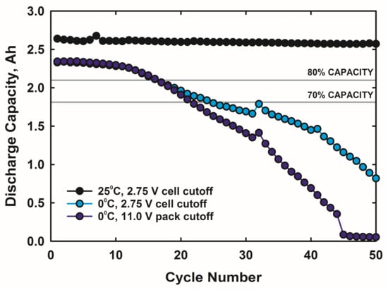 Battery pack capacity loss at 25 °C and 0 °C with discharge cutoffs when the first cell reaches 2.75 V and when the pack reaches a voltage of 11.0 V.