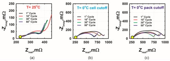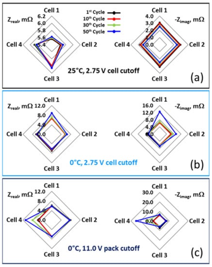 Figure 8 shows the impedance contributions for each cell in the 4S packs collected at fSOH = 316 Hz. Figure 8a shows the real and imaginary impedance of Cells 1–4 cycled at 25 °C through 50 cycles. The initial real impedance for Cell 3 is higher but does not propagate towards larger impedance with cycling. The imaginary component for all cells increases uniformly with cycling. Overall, slight initial impedance mismatch after the first cycle does not propagate towards larger scale impedance changes or variance when the pack is cycled at 25 °C. Modest and uniform increases in impedance do not significantly impact discharge capacity, as previously shown in Figure 6. The effects of impedance mismatch and imbalance are more evident with low temperature cycling. Figure 8b illustrates the real impedance increases in Cell 1 and the imaginary impedance increases for Cells 1 and 2 at the 50th cycle. For the pack voltage cut-off condition, Figure 8c, the weakest cell, Cell 4, is driven towards higher impedance as degradation increases until ultimately nearing a complete cell voltage reversal.