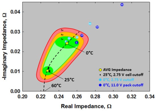 The data in Figure 3 and Figure 4 are utilized to develop the SOH Map specific to the cells under test presented in Figure 9. The SOH Map shows the average impedance response of uncycled cells at 25 °C and 0 °C, identified by a yellow circles. The dashed line represents the empirical relationship established between impedance response and local temperature, similar to that shown in Figure 4. As temperature decreases, the acceptable impedance responses shifts toward higher real and imaginary impedance. The free form shapes represent arbitrary risk indexes where green envelopes 3× the impedance variance across 0–100% SOC , orange is 4× and red is 5× the impedance variance at the identified temperatures. The boundaries for the risk indexes are developed arbitrarily, but can be informed with future safety testing of cells cycled under the abusive low temperature condition. The small black dots indicate the actual impedance response of the 4S pack to the fSOH when cycled at 25 °C for 1st, 10th, 30th and 50th cycles. There is little change in the impedance response over 50 charge/discharge cycles at this temperature. The pack level impedance response is much different for 4S packs cycled at 0 °C. The pack level impedance is shown for 4S with 2.75 V cell cutoff (light blue circles) and 11.0 V pack cutoff (dark blue circles) where the number inside the circle indicates the number of completed cycles prior to diagnostic testing. Clearly the low temperature cycling condition is abusive to the 4S pack, particularly the pack discharged to pack voltage cutoff of 11.0 V. The increased impedance which has been presented previously is due to the slow kinetics of cell reactions at low temperatures [].