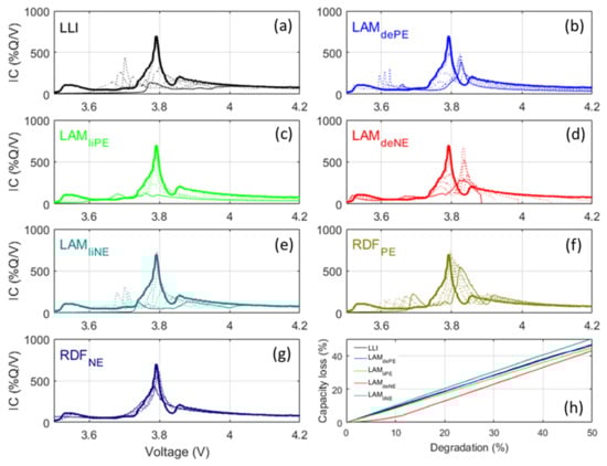 Degradation table for the selected cell with the IC curves associated with up to 50% of (a) LLI; (b) LAMdePE; (c) LAMliPE; (d) LAMdeNE; and (e) LAMliNE. IC curves associated with up to 10× kinetic hindrance for (f) RDFPE and (g) RDFNE and (h) Capacity loss associated with (a–e). Thick solid line represents the initial signature, thin solid line the final signature and dashed line the intermediates.