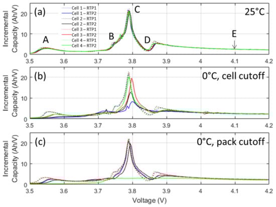 In order to characterize the degradation of the cells and validate EIS observations, reference performance tests (RPTs) were undertaken after long-term cycling at 25 °C and 0 °C and compared to the initial RPT1 measurement. Incremental capacity curves associated with the three packs cycled at 25 °C, 0 °C with cell voltage cutoff and 0 °C with pack voltage cutoff are showcased in Figure 11a–c, respectively. In Figure 11, dashed lines refer to the initial RPT1 before cycling and full lines to the final ones RPT2 after cycling. Only minimal degradation (~1.5%) is observed for the cells within the pack cycled at 25 °C (Figure 11a). A slight reduction in the incremental capacity peak height was observed for peaks A and C. Moreover, the arch position (D) shifts towards higher potentials. Changes are similar for each of the four cells within the pack. This suggests that a common degradation mechanism with minimal aging spreads uniformly amongst each of the four cells in the 4S pack. These results are typically observed in similar commercial cells cycled under non-abusive conditions [].