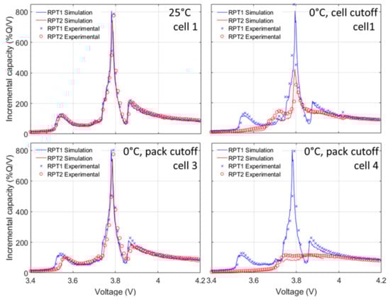 Examples of simulation results compared to experimental one for RPT1 and RPT2 for Cell 1 at 25 °C, Cell 1 of the pack cycled at 0 °C with cell cutoff and Cells 3 and 4 for the pack cycled at 0 °C with pack cutoff.