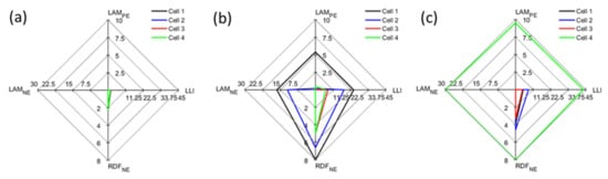 Radar plots showing the different degradation mechanisms for Cells 1 to 4 in (a) the 4S pack at 25 °C; (b) the 4S pack at 0 °C with cell cutoff and (c) the 4S pack at 0 °C with pack cutoff.