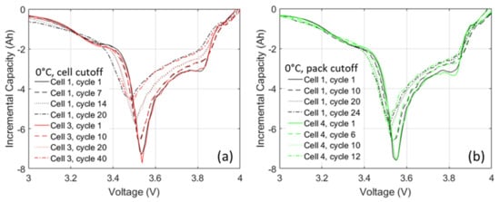 In this work, we build upon past success to broaden the applicability of the single-point monitoring technique to identify temperature-induced faults within 4S packs, specifically at sub-ambient temperature, 0 °C. At low temperatures, lithium-ion cells are prone to performance loss and a number of safety concerns associated with anode degradation [,], lithium dendrite formation [,,,], impedance increases [,], thermal fluctuations [,] and capacity and impedance mismatch amongst cells within a battery pack to create imbalance []. When cycled at low temperatures, impedance differences between cells in series can cause weaker cells to overcharge and overdischarge while the pack still maintains a perceived acceptable voltage within the normal operational boundaries.