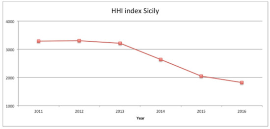 Figure 8 shows the trend of the HHI index. It is possible to see how, in the years 2014–2016, when the connection with Malta and the doubling of the Sicily-Italy connection came into operation, the zonal price of Sicily decreased significantly from 95 €/MWh to a price of about half 47 €/MWh recorded in 2016. The Herfindahl-Hirschman Index (HHI) index, which characterizes the competitiveness of a market, also recorded a significant decrease (halving its value) thus demonstrating greater flexibility of the system.