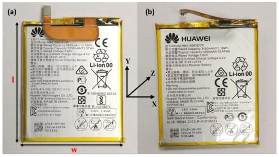 Both Nexus 6P phones were disassembled using the methodology described in the tear-down procedure of [14]. Figure 1 and Figure 2 show the disassembled phones and the removed Li-ion batteries. The battery area is shown in the front panel after removing the battery in Figure 1b,d. On the top side, ratings for the batteries are marked on the pouch in Figure 2. Both the batteries have a small circuit board attached to their terminals. The dimensions of the batteries have been measured using a calliper. If the top side face of battery in Figure 2a represents the X-Y plane, then the thickness was measured along the Z direction at the geometric center of the rectangular top face of the battery. The length was measured along Y-axis at the left edge without the circuit board, and width was measured along the X-axis at the bottom edge which is on the opposite side of the board. The length and width have been represented on Figure 2a by l and w respectively. The ratings and measured dimensions of the two batteries are given in Table 1.