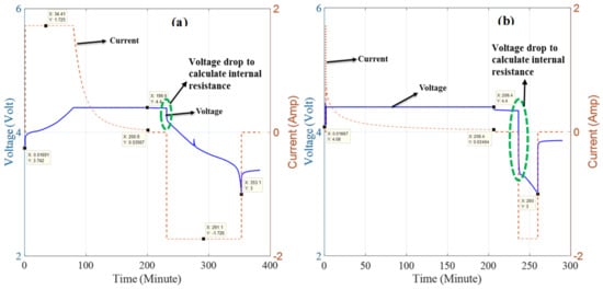 The rated capacity for the Li-ion batteries in this study is 3.4500 Ah. The limited charge voltage on the battery pouch is specified to be 4.4 V (Table 1). The capacity testing was conducted with an Arbin BT2000 Battery Tester, over the voltage range of 4.4–3.0 V to obtain the full cycle for the battery as per its specifications. The value 3.0 V was chosen to be the end of discharge voltage to avoid overdischarge. The battery was charged using a standard constant current—constant voltage charging algorithm. Firstly, a constant C/2 charge rate was applied until the battery terminal voltage reached 4.4 V, and after that, the 4.4 V voltage was maintained across the battery terminal until the current dropped down below C/100. After the charging operation, the battery was rested (no charge-discharge operation) for 30 min to attain thermal and Li-ion concentration equilibrium and then discharged to 3.0 volt again using a constant C/2 rate. Figure 3a,b shows the voltage and current profiles during charging and discharging of the two batteries. Positive and negative current values in the figures correspond to the charging and discharging operations, respectively. The amount of charge delivered by the battery during the discharge period is defined as the discharge capacity of the battery. The internal resistance values of the batteries were measured using the programmable facility of the Arbin BT2000 Battery Tester at 100% state of charge (SOC) condition after constant current—constant voltage charge. Three measurements were collected for each battery. The internal resistance measurements were also obtained using the instantaneous (1 s) voltage drop (marked by green ellipse in Figure 3a,b) after the application of discharge current at 100% SOC.