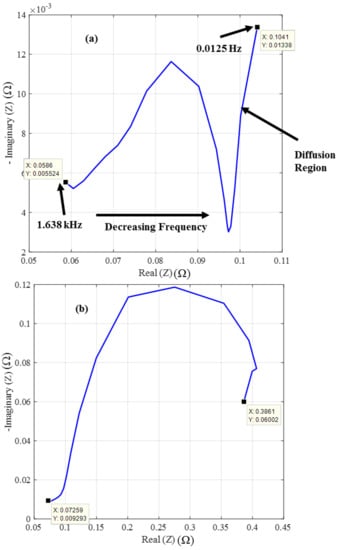 Three measurements for each battery were taken at 100% SOC (fully charged) with an interval of ~3 min between each measurement. Figure 4a,b shows the mean values of the three measurements for the two batteries after the second cycle. The maximum variance along the Real (Z) axis was and maximum variance along the Imaginary (Z) axis was , signifying small variations among impedance measurements.
