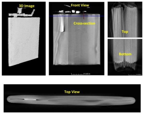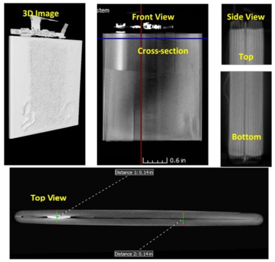 Figure 5 is a 3D CT image (front view, side view and top view) of the battery from the new smartphone after it had completed 20 charge–discharge cycles. The figure shows that the electrodes are uniformly arranged and there are no signs of ruffling or degradation. The CT scan analysis did not reveal any material contaminants or design defects in the new smartphone battery. Figure 6 shows a significant amount of non-uniformity in the positioning of the electrode layers in the used battery. The non-uniform separation between electrode layers will cause non-uniform distribution of electrolyte between layers leading to localized spots of high and low ohmic resistances. Since the battery temperature is affected by the ohmic heating during the charge–discharge operation, the non-uniform resistance distribution will cause uneven temperature distribution. This uneven temperature distribution is highly detrimental for battery performance and can lead to accelerated degradation of the battery. Also, the regions of small separation between electrode layers will be prone to internal short-circuiting through lithium dendrites.