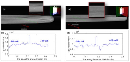 Figure 7 shows two areas with higher grayscale values compared to the nearby jellyroll material inside the used battery. The grayscale values along the (green) lines passing through two points were measured (Figure 7b,d). The CT scan images (Figure 7a,c) indicate the possibility of contaminant particles inside the jellyroll. However, the composition and nature (metallic or non-metallic) of these particles could not be confirmed using CT scanning.