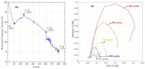 (a) Capacity fade curve of the new smartphone battery and (b) impedance spectrum evolution for the new smartphone battery during cycle life testing.