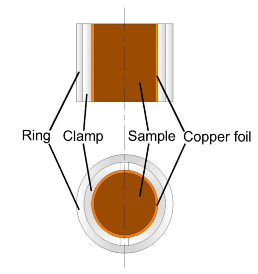 The in-situ mechanical state of raw sample was simulated by constraining the radial deformation of raw sample prior to the sub-critical water extraction: firstly, the raw sample was circumferentially warped by a strip of copper foil. Then, the raw sample was gripped by the clamps and banded by the ring. The gripped sample is presented in Figure 1.