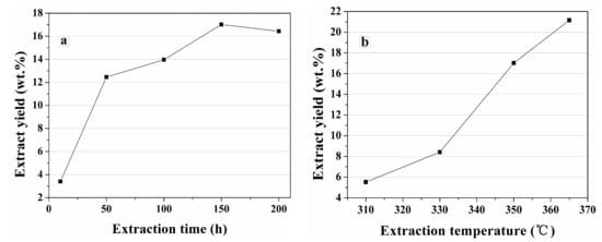 Figure 2a shows the yields (wt.ad) of bitumen extracted by sub-critical water at 350 °C. It can be observed that the yield rises dramatically from 3.4 to 12.5 wt % as the extraction time is increased from 10 to 50 h. It then increases slowly from 12.5 to 17.0 wt % with the extraction time prolonged from 50 to 150 h, and finally reduced to 16.4 wt % at 200 h. The maximum extract yield is achieved at 150 h, indicating that the initial bitumen extraction is much more rapid. The decrease of extraction efficiency later may be due to the decomposition of a large amount of weak-binding kerogen fragments [10]. The yield decreases with extraction time exceeding 150 h possibly due to the decomposition of more extracted bitumen to gases [9,10,11].