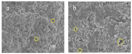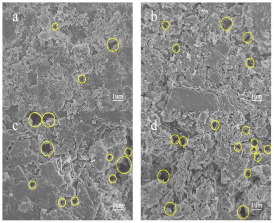 Figure 4 shows SEM images of the spent shale samples after 150 h extraction by sub-critical water at 310 °C to 365 °C. Compared with the pore distribution of the raw sample (Figure 3a), only few pores were generated after 310 °C sub-critical water extraction (Figure 4a). Pores in spent samples obviously developed and extended to the inner part of the shale matrix, and their pore size gradually increased from the nano- to micron-size with increasing extraction temperature (Figure 4b–d). This correlates with results obtained by Bai et al. [8]. The evolution of yields with temperature (Figure 2b) were similar to those of pore size.