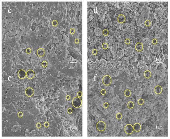 SEM images of (a) raw sample and spent shale samples extracted by sub-critical water at 350 °C for (b) 10 h; (c) 50 h; (d) 100 h; (e) 150 h; and (f) 200 h extraction, respectively.