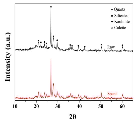 XRD patterns of raw sample and spent sample extracted by sub-critical water at 350 °C for 150 h.