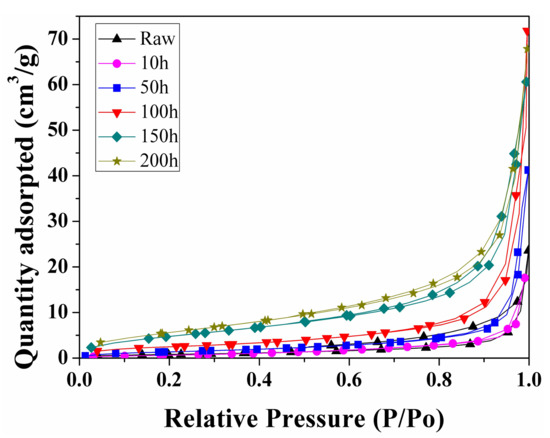 The SEM analysis mainly reveals the surface pore morphology evolution of shale samples, while it contributes little to the specific surface area and PSD. The N2 adsorption/desorption method is widely used to explore the pore shape and structure, particularly for mesopores (2–50 nm), according to the IUPAC classification. Typical nitrogen adsorption/desorption isotherms of the raw and spent shale samples extracted by sub-critical water at 350 °C for different time are shown in Figure 6, which correspond to a composite of Types II defined by IUPAC and indicate multi-layer adsorption. The adsorption branches of the isotherms gradually rise below P/P0 ≈ 0.8. When P/P0 > 0.9, the adsorption quantity sharply increases because of capillary condensation [36]. At relative pressures below 0.7, the adsorption isotherm is essentially coincident with the desorption isotherm, indicating that small pores are accessible via a single pore throat. As the relative pressure rises, a hysteresis loop occurs, which is attributed to the difference between the adsorption and desorption mechanisms. The hysteresis loops of the spent samples are similar to type H3 under the IUPAC classification [37], indicative of a slit pore shape.