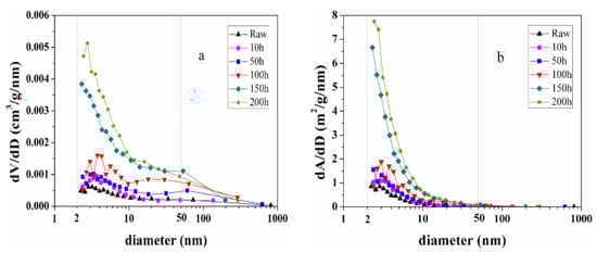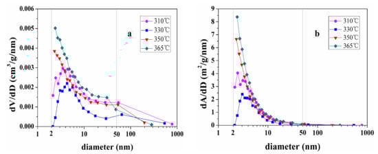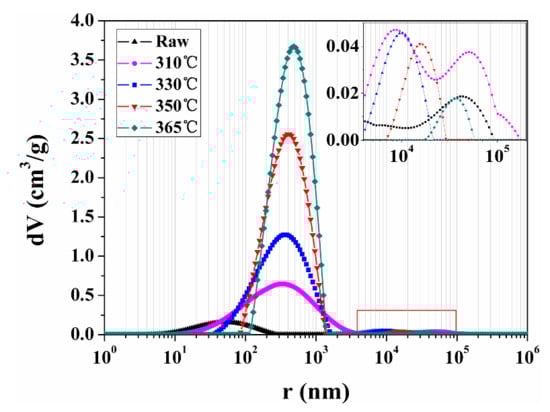 Figure 7 shows the pore size distribution and specific surface area of spent samples extracted at 350 °C for different times.