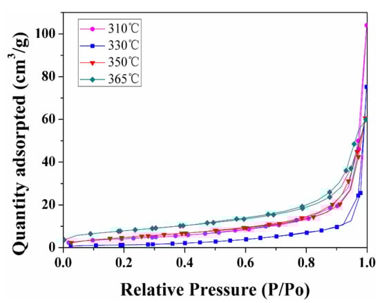 Figure 8 displays a typical nitrogen adsorption/desorption isotherm of the spent shale samples extracted by sub-critical water for 150 h at different temperature. They are assigned to type II, and the four hysteresis loops are similar to type H3. The adsorption branches of the isotherms gradually rise below P/P0 ≈ 0.8. When P/P0 > 0.9, the adsorption quantity sharply increases because of capillary condensation. At relative pressures below 0.7, the adsorption isotherm is essentially coincident with the desorption isotherm, indicating that small pores are accessible via a single pore throat. As the relative pressure rises, a hysteresis loop occurs, which is attributed to the difference between the adsorption and desorption mechanisms.