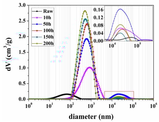 Pore size distribution (PSD) of the raw sample and spent samples extracted by sub-critical water at 350 °C for different times. The inset figure is the local enlarged drawing of curves in the red rectangle.