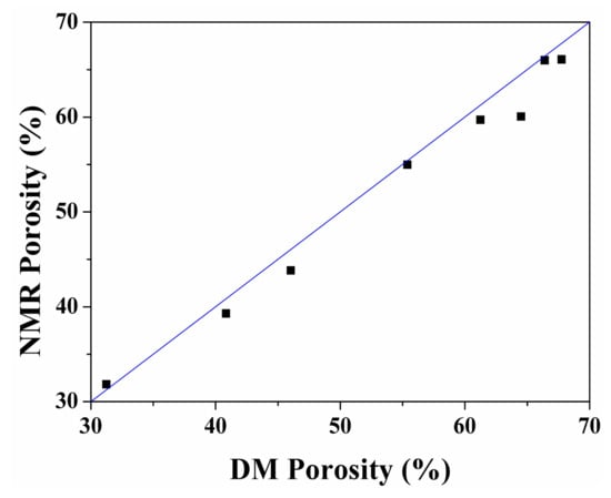 Because the NMR PSD of samples and the hydrogen content in fluids have a strong positive correlation, NMR can also be used in analyzing porosity. Figure 12 shows a comparison between the porosity of the above spent samples extracted by sub-critical water measured by density measurement (DM) [46] and the NMR method. The x-axis and y-axis data of points in this figure correspond to the DM porosity and the NMR porosity of spent shale samples, respectively. The blue curve in Figure 12 is the DM porosity-NMR porosity parity line and all points are close to it revealing porosity measured using NMR has a good correlation with that measured using DM. Consequently, the NMR method can truly reveal the porosity of oil shale samples, and the NMR method is suitable for determining the porosity of shale.