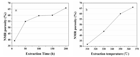 Figure 13 shows the porosity of spent samples extracted by sub-critical water determined using NMR. In Figure 13a, porosity increases dramatically, and then increases slowly with prolonged extraction time. In Figure 13b, porosity rises dramatically with increased extraction temperature. With increased extraction time, increments in the yield of bitumen and the evolution of porosity showed a similar tendency (Figure 2a and Figure 13a). There is a similar situation that as the temperature increases, increments in the yield of bitumen and the evolution of porosity showed a similar tendency (Figure 2b and Figure 13b).