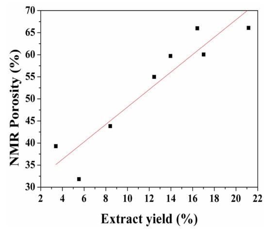 A positive correlation was found between the extract yield and porosity (R2 = 0.9). Considering results of NMR PSD, it is suggested that during sub-critical water extraction, the porosity evolution of spent samples is caused by the formation of secondary organic matter pores.