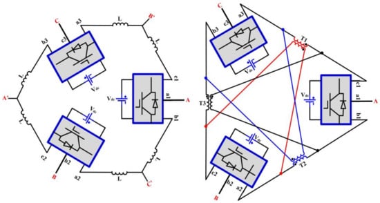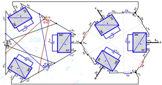 The proposed configuration of the three-phase grid-connected applications is shown in Figure 2. This configuration is composed of six traditional two-level, three-phase VSC modules that have hexagonal interconnections to produce higher voltage levels, as shown in Figure 2. Each VSC module supplies 1/6 of the converter’s output power.
