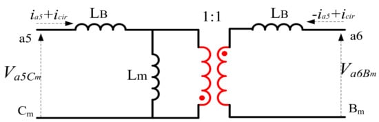 This section investigates the function of the magnetic elements within the proposed converter. Two inductors with an equal number of turns are coupled together; that is, an input to one side produces an output on both sides, as shown in Figure 3. As the turn ratio is approximately 1:1, the self-inductances of the primary and secondary windings are the same (e.g., ). The two-winding magnetic element T4 is selected for analysis. Applying the voltage relationships from two-winding transformers results in the following equations: