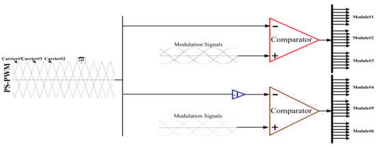 To obtain an output voltage with low total harmonic distortion, a multicarrier PS-PWM [21] switching strategy is implemented to drive each IGBT in the converter. Optimum harmonic cancellation is accomplished by shifting each carrier cell by 2πTs/3T in sequence, where Ts is the switching time and T is the cycle modulation time. Figure 4 shows the relationship between the modulation waveforms and the three groups of carriers within the converter. As shown in Figure 3, the triangular carriers (carrier 1, carrier 2 and carrier 3) are phase-shifted 120° relative to each other and directly compared with the modulation signals to drive the IGBTs within the VSC modules. To generate the switching signals that are used to drive the IGBTs within module 4, module 5 and module 6, the carrier signals are inverted and then compared with the modulation signals.