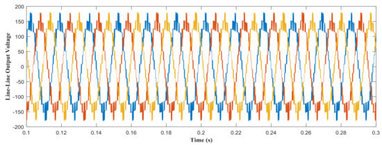 The proposed converter can be implemented using various VSCs with six isolated DC links. The two-level VSC topology is chosen for implementing the present topology because of its simplicity. To confirm the theoretical analysis provided in Section 3, simulations are carried out in the MATLAB/Simulink environment. The DC-link voltage is 30 V. The output terminals of the converter are connected to an inductive load of 77 mH, connected in a wye configuration.
